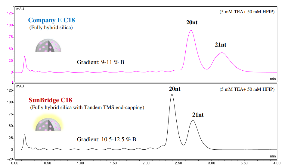 SunBridge C18 3 µm is effective for improving separation performance and ensuring stable operation in oligonucleotide analysis under high-temperature and high-pH conditions.