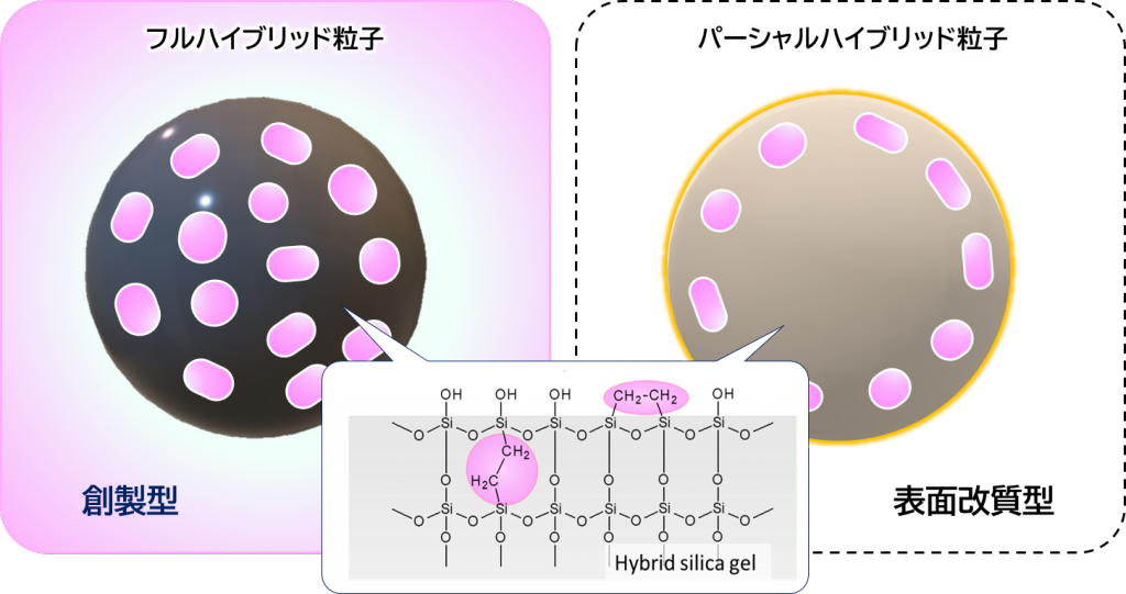ハイブリッド粒子で製造したカラムは世の中に多数あります。ハイブリッド粒子とはシリカ(無機)にエチレンなどポリマー(有機)を架橋した充填基材のことで、有機シリカと呼称される場合もあります。アルカリへの高耐久性が主な特徴と言われますが、シリカ表面を改質したパーシャルハイブリッドシリカ粒子と有機シリカを創製したフルハイブリッドシリカ粒子では、実は耐久性能が大きく異なります。