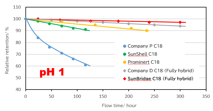酸性条件(pH 1)においてもSunBridgeは高い性能を示します。官能基の脱離を防ぐ上で表面の不活性化処理が安定性向上に寄与していると考えられ、SunBridgeは耐酸性の面でも既存のフルハイブリッドカラム(D社)をも凌駕します。例えば当社のSunShell(緑色)はコアシェルカラムの中で遥かに高い耐久性能を有していますが、SunBridgeはそれと比較しても異次元の耐酸性を有している事がよく分かります。