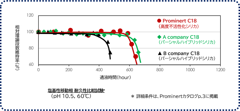 例えば、当社が2022年に開発した汎用HPLC向けコンセプトカラムProminert(プロミナート)は3.5 μm高効率シリカ粒子の採用と共に高耐久化を特徴としていますが、この基材はハイブリッド(有機シリカ)粒子ではなくあくまでシリカ粒子です。しかし下記図に示すように表面に対する高度不活性処理(Tandem TMS end-capping)の適用によって、他社パーシャルハイブリッドに匹敵する高耐久性を有しています。工程は異なるもののエンドキャッピングもシリカ表面の改質処理と言え、事実、高度不活性処理を施したシリカカラム(Prominert)は、パーシャルハイブリッドカラムと比べてアルカリ耐久性の差異が殆ど無い事が分かります。因みに2015年に上市したSunArmorはパーシャルハイブリッドの類型です。