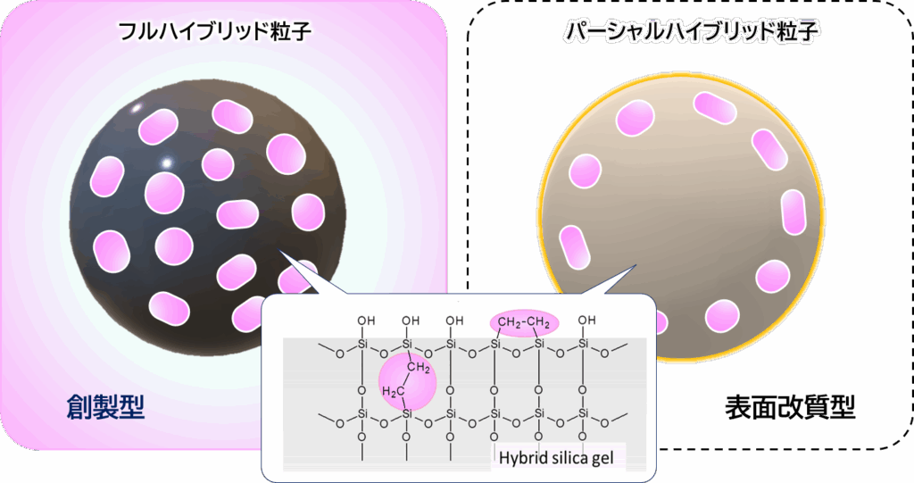 ハイブリッド粒子で製造したカラムは世の中に多数あります。ハイブリッド粒子とはシリカ(無機)にエチレンなどポリマー(有機)を架橋した充填基材のことで、有機シリカと呼称される場合もあります。アルカリへの高耐久性が主な特徴と言われますが、シリカ表面を改質したパーシャルハイブリッドシリカ粒子と有機シリカを創製したフルハイブリッドシリカ粒子では、実は耐久性能が大きく異なります。