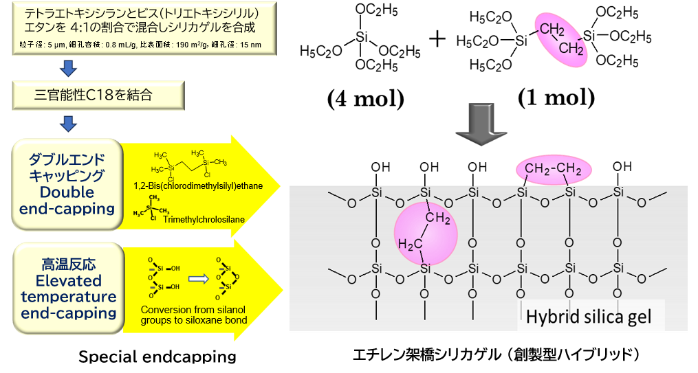 SunBridgeの卓越した安定性の理由は充填剤の合成技術にあります。創製したエチレン架橋シリカゲルを用いるだけでなく、高度エンドキャッピング処理の適用によって「内側も外側も」言わば二刀流の不活性化を行っている事が高い安定性の秘訣です。汎用的な移動相条件は勿論、高負荷のかかるイオンペア条件、連続分析、分取精製など多用途での活用が期待できます。